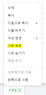 보호를 원하는 시트인덱스에 마우스 오른쪽 버튼을 클릭해서, '시트 보호' 항목을 선택합니다.