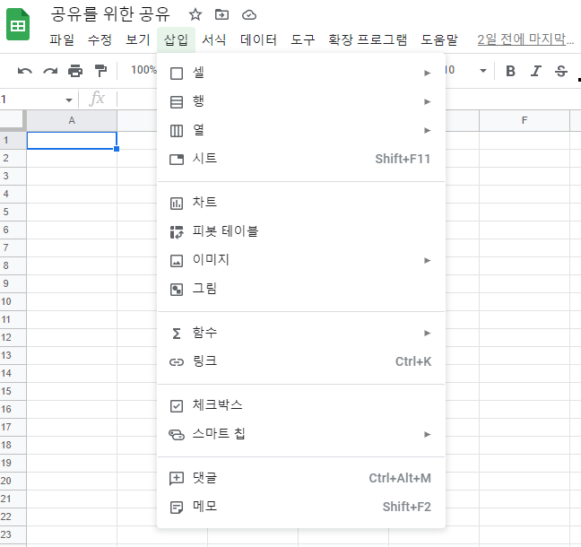 '삽입-시트' 메뉴를 선택하거나 단축키 쉬프트 + 에프11을 누르면 문서 내에 새로운 시트가 하나 생성됩니다.