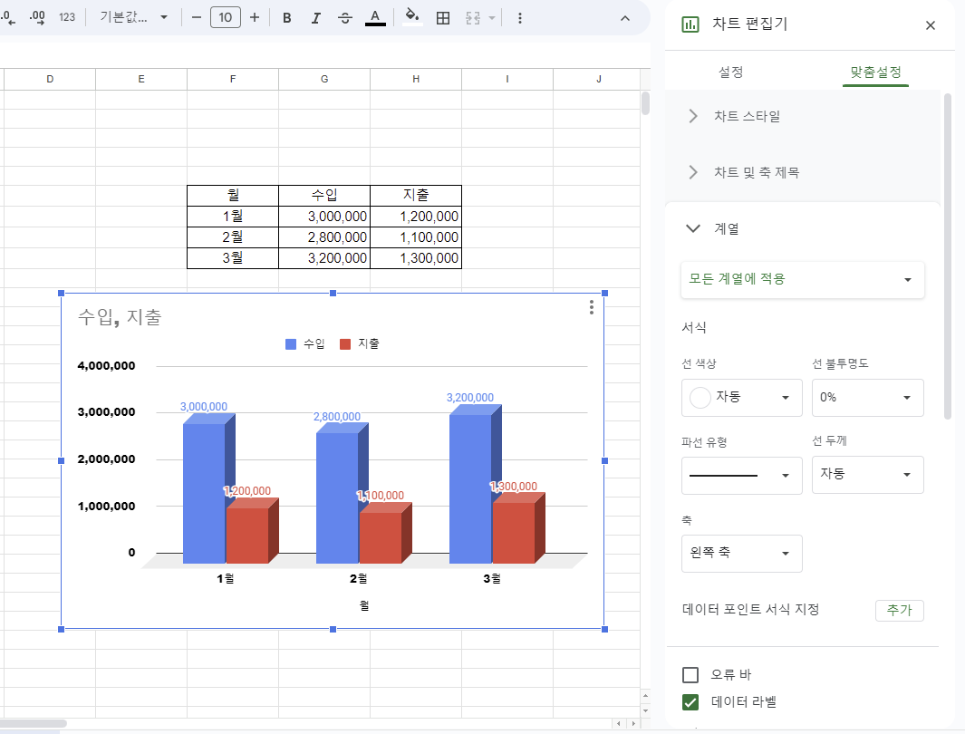 - 축(Axis): 차트의 X축과 Y축 레이블을 편집할 수 있습니다.