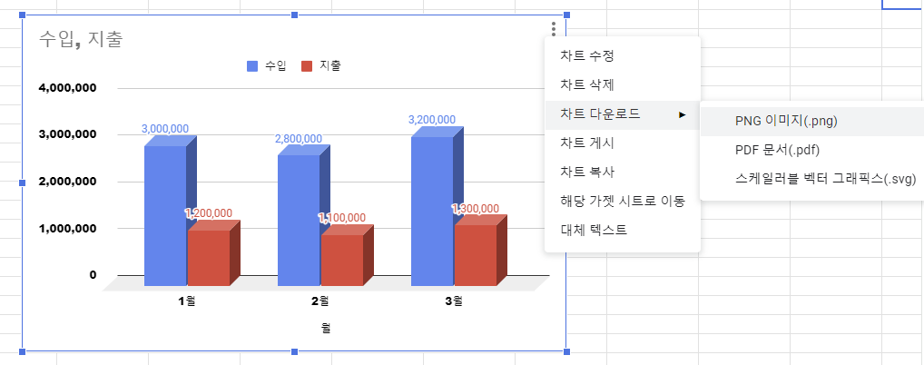 - 그래프만 따로 이미지로 저장하여 공유하고 싶은 경우, 그래프 오른쪽 위 3개의 점을 클릭하면 저장 메뉴를 찾을 수 있습니다.