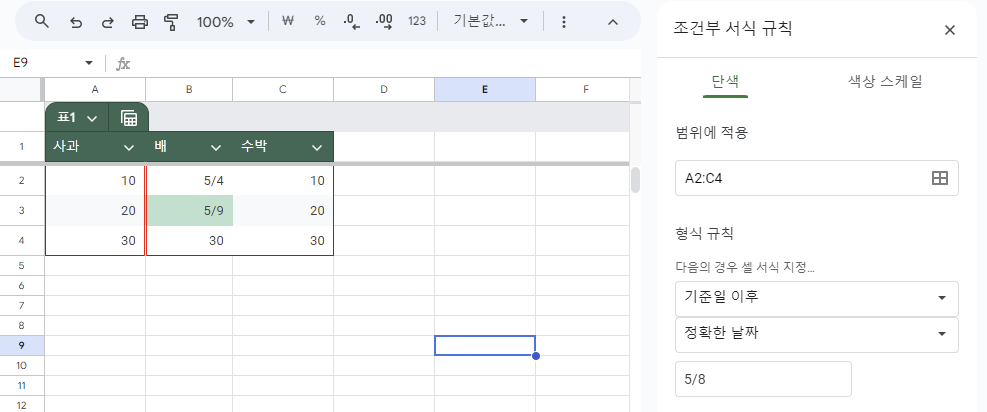 (1) 날짜 : 선택하거나 입력한 날짜와 동일한 데이터가 있는 셀의 스타일을 변경합니다.