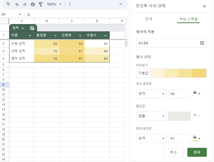 색상 스케일은 선택한 데이터 범위의 값에 따라 셀의 배경색을 점진적으로 변화시키는 기능입니다.