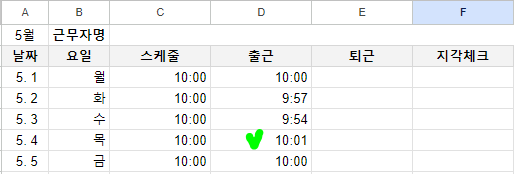 5월 4일 목요일에 1분을 지각했네요. (사실 이 정도는 상습적이지 않으면 봐주죠 ㅎㅎ)
