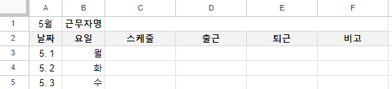 날짜, 요일, 근무자명, 출근시각, 퇴근시각, 비고 등으로 우선 작성을 해보겠습니다.