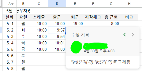 출퇴근 솔루션을 쓰지 않지만, 수기로 쓰는 것은 조금 불안한 경우 구글 스프레드시트를 활용하여 출근부를 만들수있습니다.