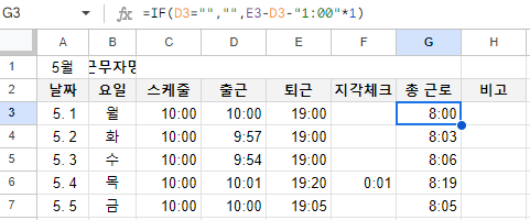 출근이 빈칸이면 그대로 빈칸으로 두고, 출근시간이 입력됐으면 퇴근-출근-고정휴무1시간 이 계산되게 합니다.