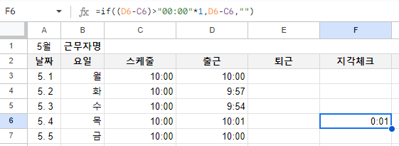 딱 봐도 지각 한 것 같은 날짜에 시범적으로 함수를 적용해 봅니다.