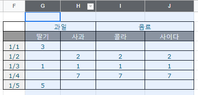 그렇기 때문에 상단 가로 목록으로 식재료를 입력하고, 세로로 날짜를 추가해 나갑니다.