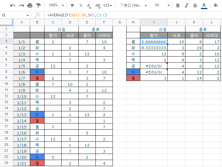 averageif 함수를 사용해 매주 월요일마다 구매했던 딸기의 평균 수량을 구합니다.