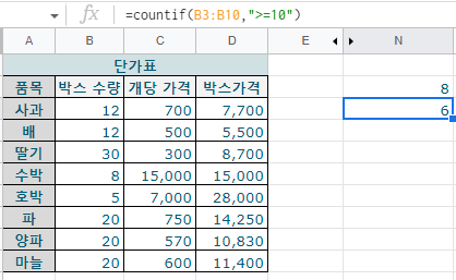 라는 함수입니다. 10보다 작은 값이 2개 밖에 없으니 총 데이터(8) - 10보다 작은 데이터(2) = 6 맞죠?