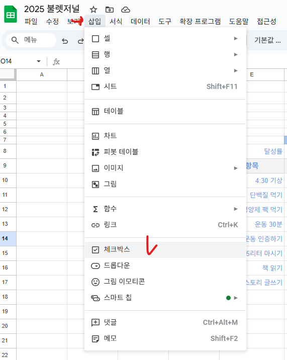 그리고 '삽입' 메뉴에 '체크박스'를 선택하여 주르륵 삽입해준다.