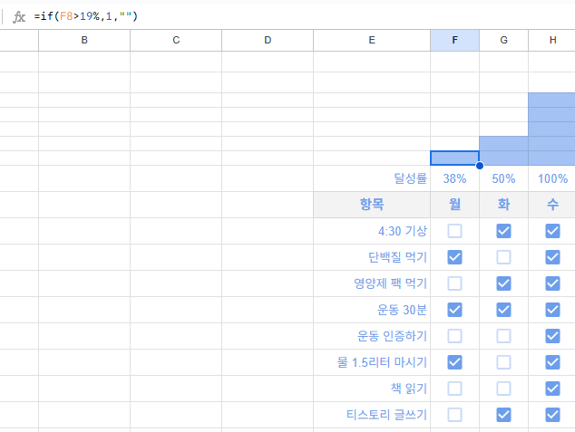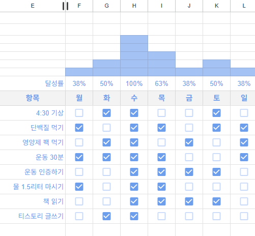 오늘 내가 만들 트래커는, 해당 항목에 체크를 하면 요일마다 달성률이 자동 계산이 되고 달성률에 따라 막대 그래프가 생기는 형식이다.