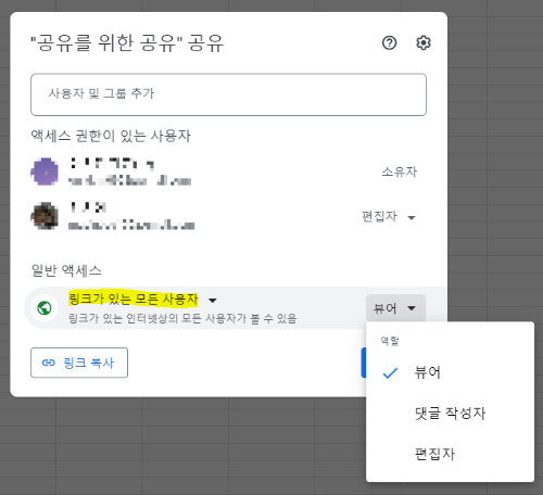 '링크가 있는 모든 사용자'를 선택하고 완료버튼을 누르면 아래와 같이 링크를 통해 들어온 사용자의 권한을 또 설정할 수 있습니다.