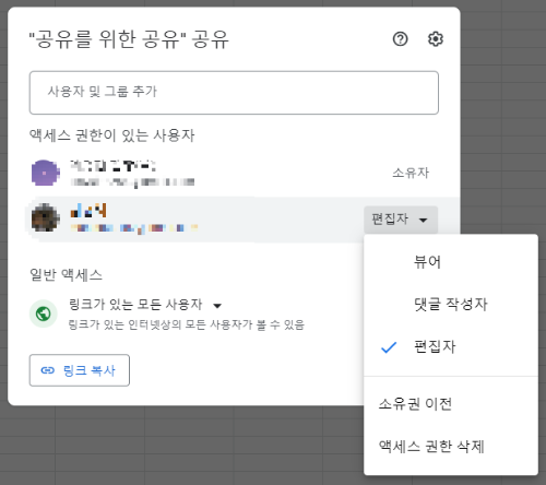 '편집자'를 선택하면, 링크를 통해 시트에 접근하는 모든 사람이 시트 데이터를 수정하고 변경/추가할 수 있습니다.
