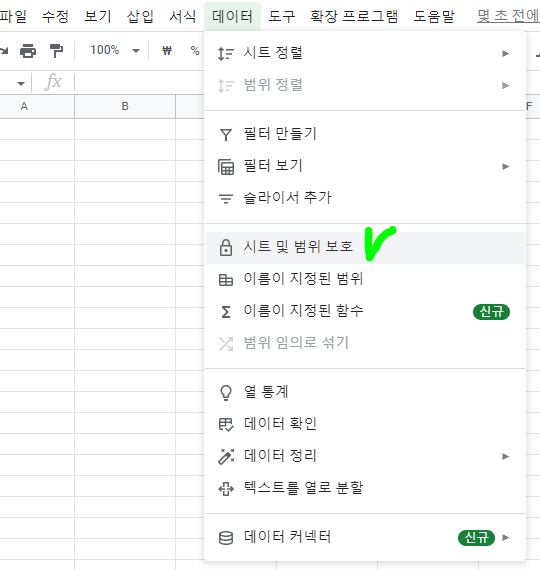 상단 메뉴 데이터 - 시트 및 범위 보호를 선택합니다.