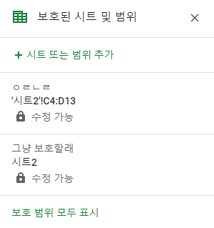 아래쪽 '보호 범위 모두 표시'를 누르면, 해당 시트뿐만 아니라 작업 중인 문서 다른 시트에 적용된 보호범위로 다 보여줍니다.