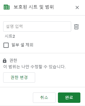 그리고 밑에 권한 설정이 있습니다. 공유처럼 보호시트에 대한 권한을 설정할 수 있습니다.