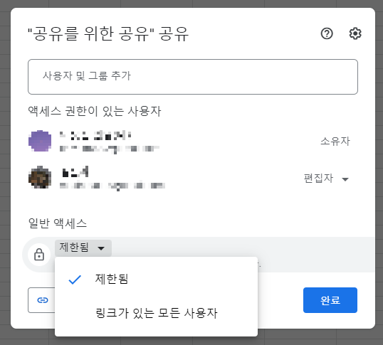 제한됨은 링크 주소만 준다고 해서 해당 시트에 접근이 되는 것이 아니라, 위의 '사용자 및 그룹추가'를 사용하여 대상자의 메일주소를 입력해서 직접 추가해야 시트에 접근이 가능합니다.