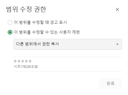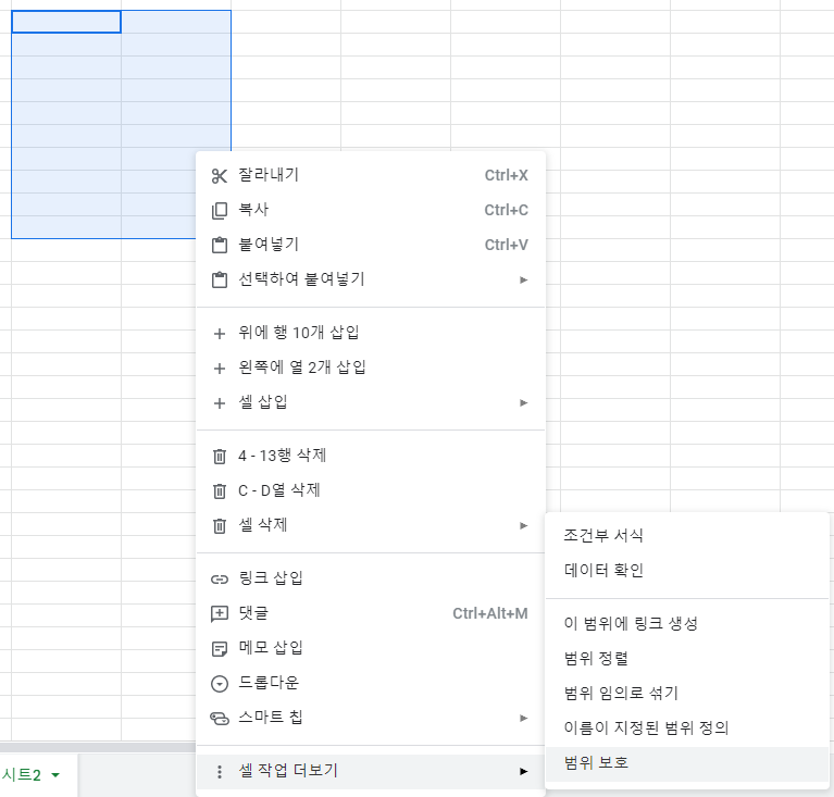 시트는 해당 시트 자체를 잠가버리는 거지만, 범위는 편집권한이 공유되어 있는 시트에서 일정 부분만 보호합니다.