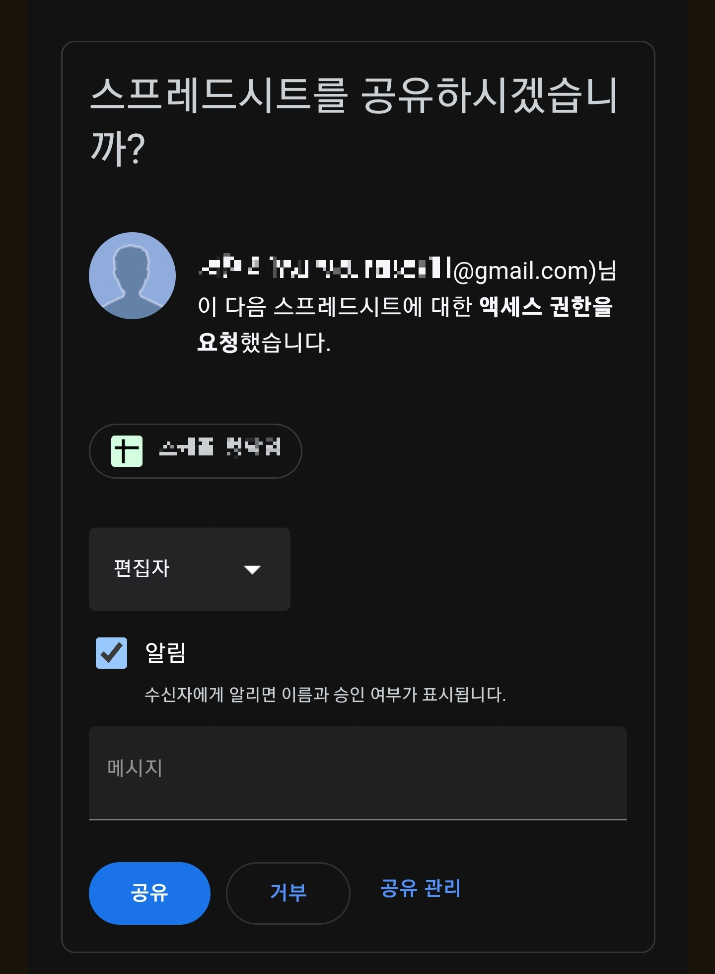 위와 같이 공유 요청 메일이 도착했습니다..