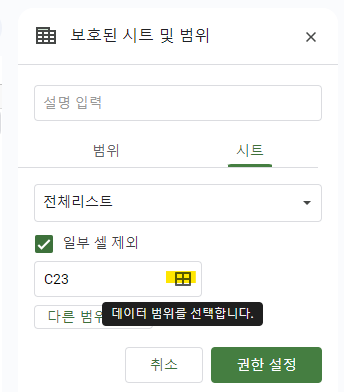 '시트'가 아니라 왼쪽의 '범위'를 선택하면, 전체를 다 허용하지만 기록하면 안되는 범위'만' 보호가 되게끔 지정할 수 있습니다.