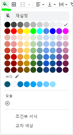 엑셀에서는 한번 셀 색을 정하면, 자동 유지가 되어 다른 셀을 선택하고도 페인트 버튼을 누르기만 하면 바로 직전 선택 색이 적용이 되지만, 스프레드 시트는 매번 색을 다시 선택 해주어야 합니다.