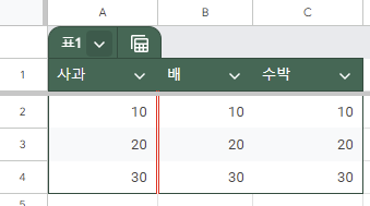 첫 번째 행을 카테고리로 인식하여 자동으로 '틀 고정'을 시켜주고, 필터까지 생성해 줍니다.