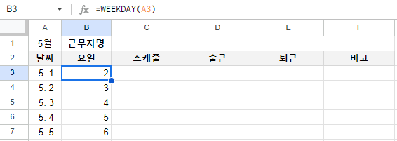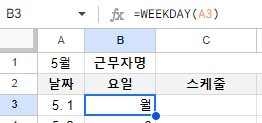물론 수기로 일일이 월, 화, 수 라고 써도 되지만 날짜가 추가되거나 했을 때 자동으로 요일이 기록되도록