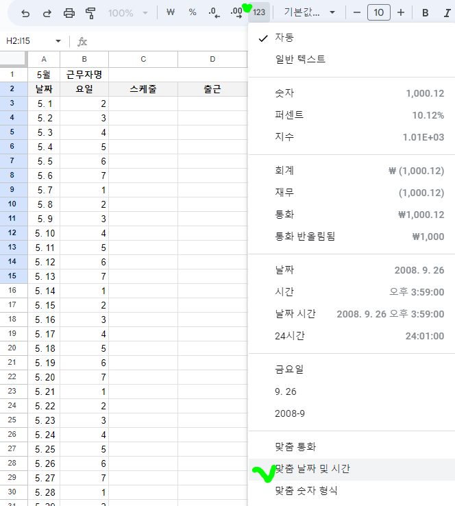 혹시나 그럼에도 불구하고 날짜의 형식으로 보이지 않는 경우 '123' 이라고 쓰여있는 아이콘을 눌러 셀