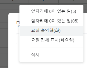 이렇게 팝업이 뜨게되면, 요일 축약형(화)를 선택합니다.
