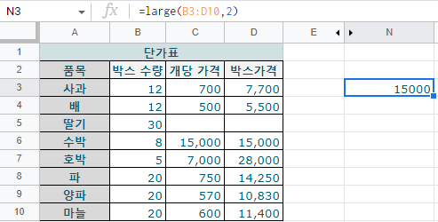 예제 사진을 보시면, b3에서 d10 범위안에 있는 데이터 중에서 2번째로 큰 값을 구하라고 했습니다.