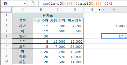 굳이 이렇게 활용할 일은 없어보이긴 합니다만, 박스 수량 데이터 중에서 가장 큰 값과, 가장 작은 값을 더해서 나눈 값을 구해보겠습니다.