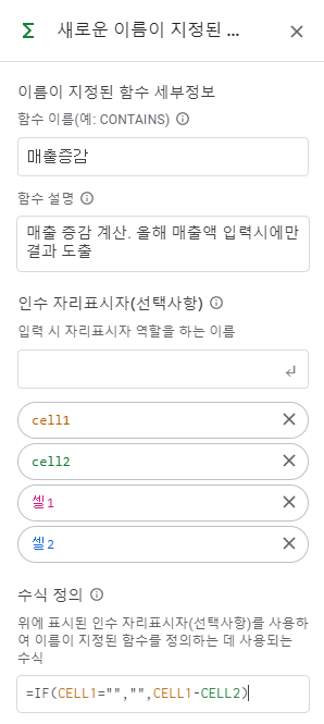 그럴경우 'IF(올해 매출 셀="","",올해 매출 셀-작년매출셀) 이런식으로 함수를 입력하게 되겠죠. 이럴 때, 후자의 길어진 함수를 '매출증감' 이라는 나만의 함수로 지정해버리는 겁니다. 아주 편리한 기능이니 적극적으로 활용하시면 업무시간을 조금 더 단축시킬 수 있지 않을까 합니다.