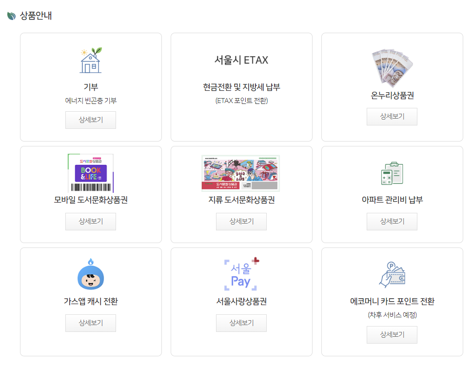 서울시에서는 적립된 에코마일리지를 이용해 공공요금(예: 수도세, 전기세 등)을 납부할 수 있는 서비스를 제공하고 있습니다. 이렇게 납부한 금액만큼 현금을 절약할 수 있어, 마일리지를 현금처럼 사용할 수 있습니다.