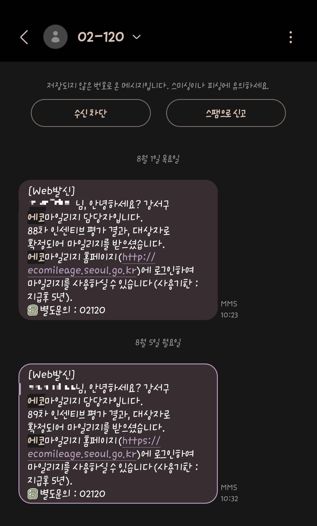 저는 8월 1일에는 5만 마일리지를 받아 5만 원을 인출했고, 5일에 온 메시지를 통해 추가로 1만 원을 더 인출했습니다.