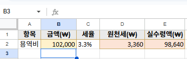 우선 일반적으로 원천세가 계산될 D2셀에는