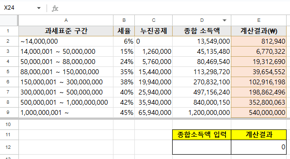 바로 하래 노란 구간만 만들어도 되지만, 세율이 계속 변하기 때문에 위의 표를 따로 만들었습니다.