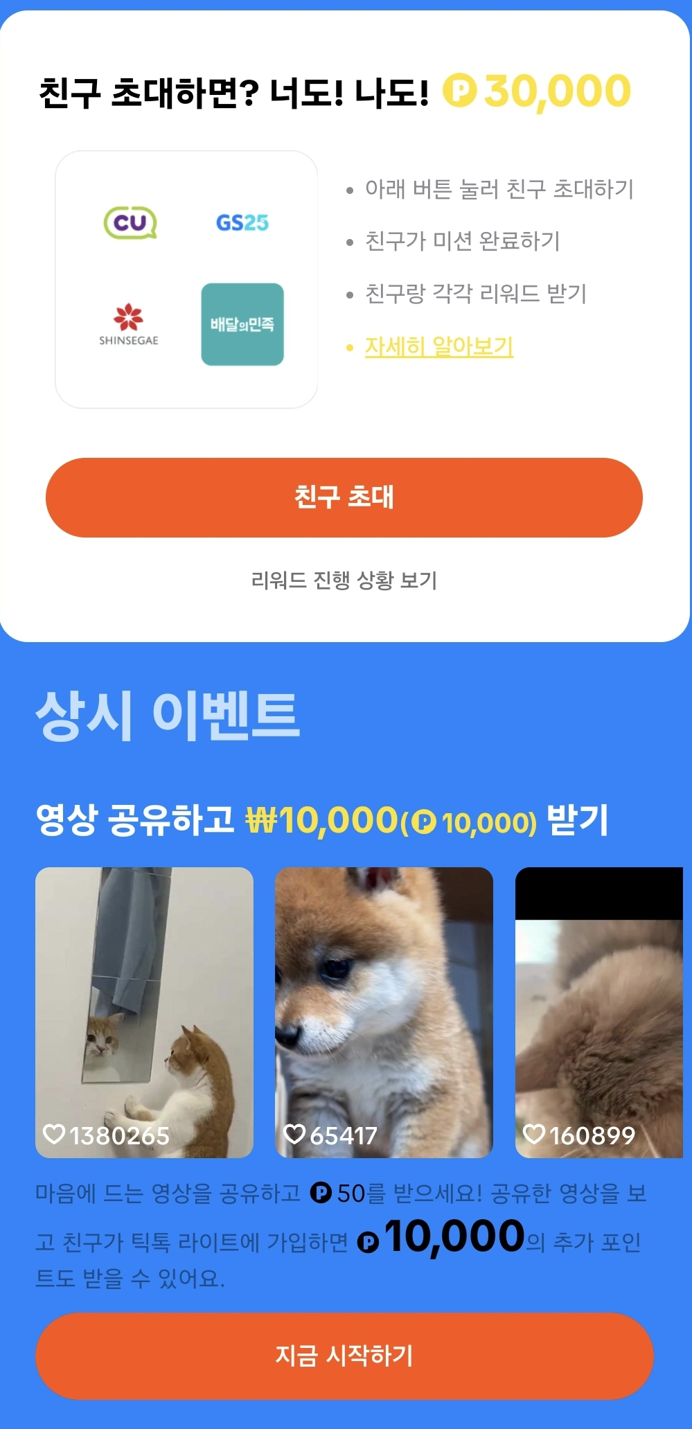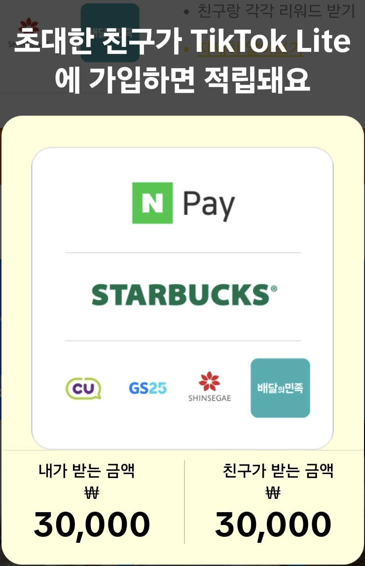 원래 틱톡라이트 하던 사람은 해당안되고, 초대 링크를 통해서 가입을 해야 적용되는 것 같음.