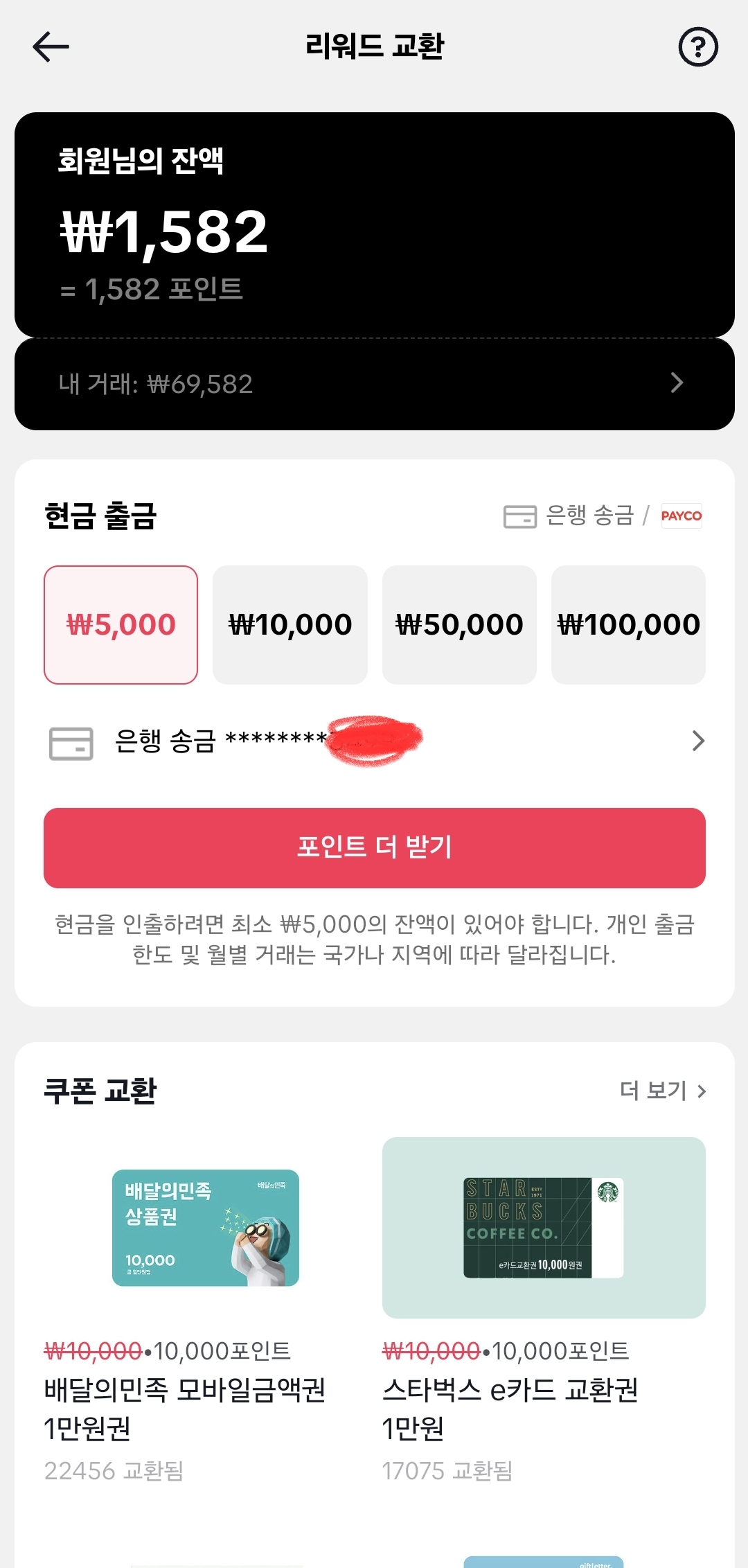 계좌 등록 후 계좌로 출금하셔도 되고, 아래에 한 8개 종류의 쿠폰교환이 있어서 쿠폰으로 교환하셔도 됩니다.
