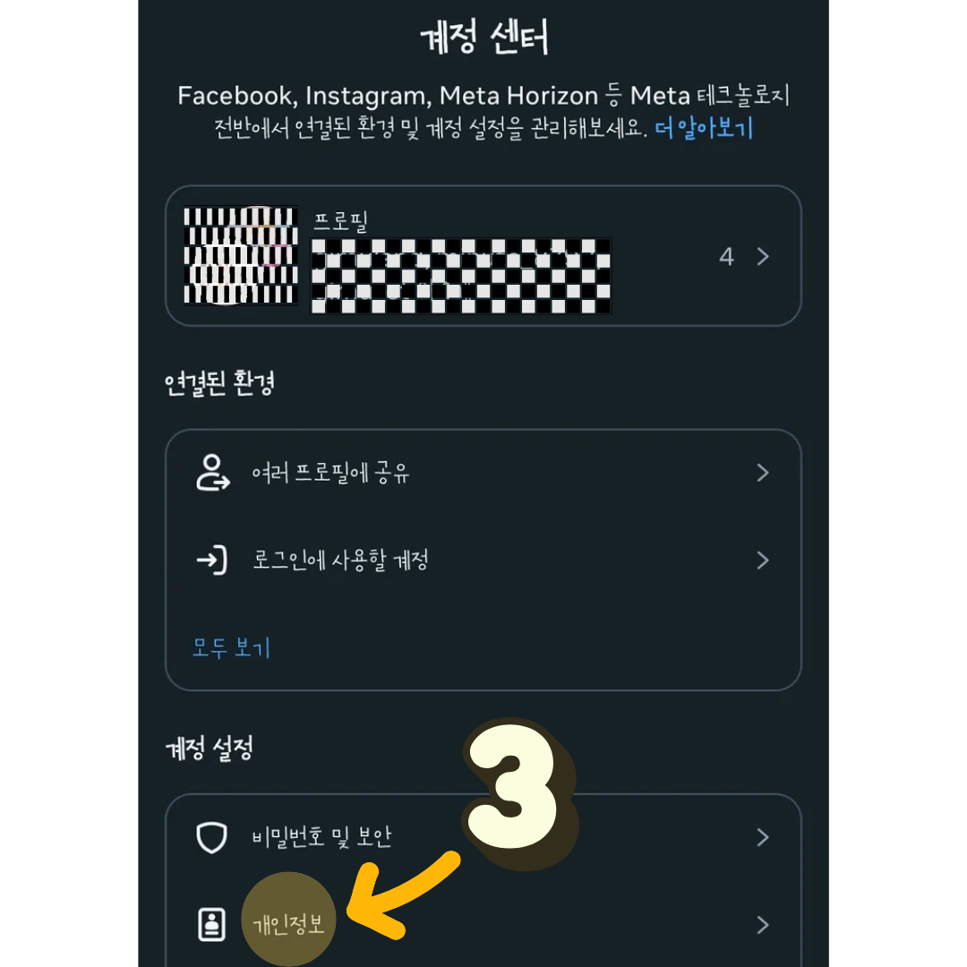 3. 계정 센터에 들어가면 또 다시 계정 설정이 있고, 개인 정보 메뉴를 선택해 줍니다.