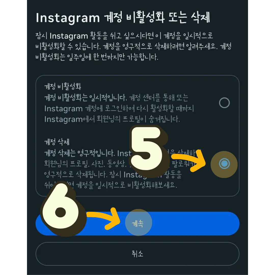 5. 비활성화 또는 삭제가 나오면 삭제를 선택하고 계속을 눌러줍니다.
