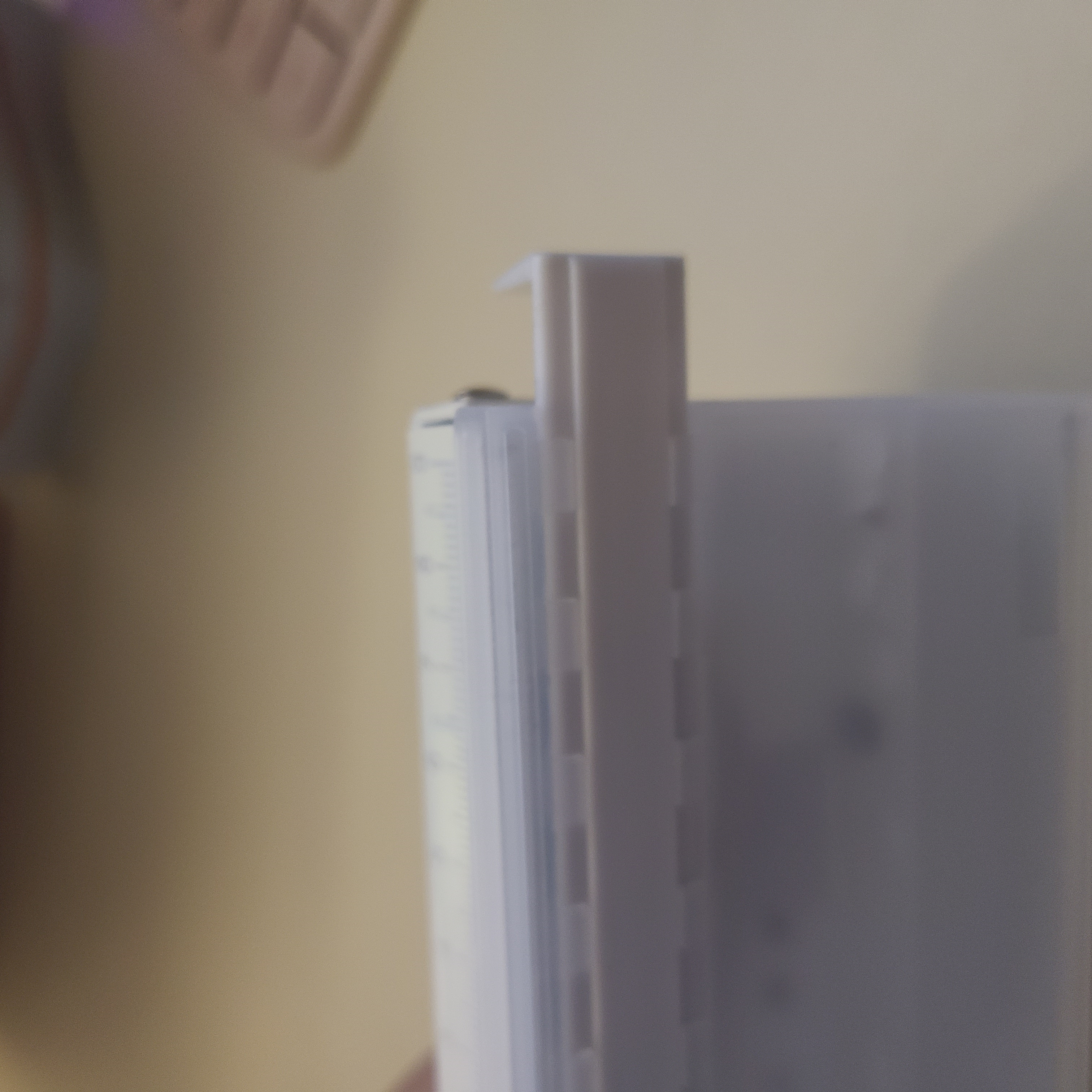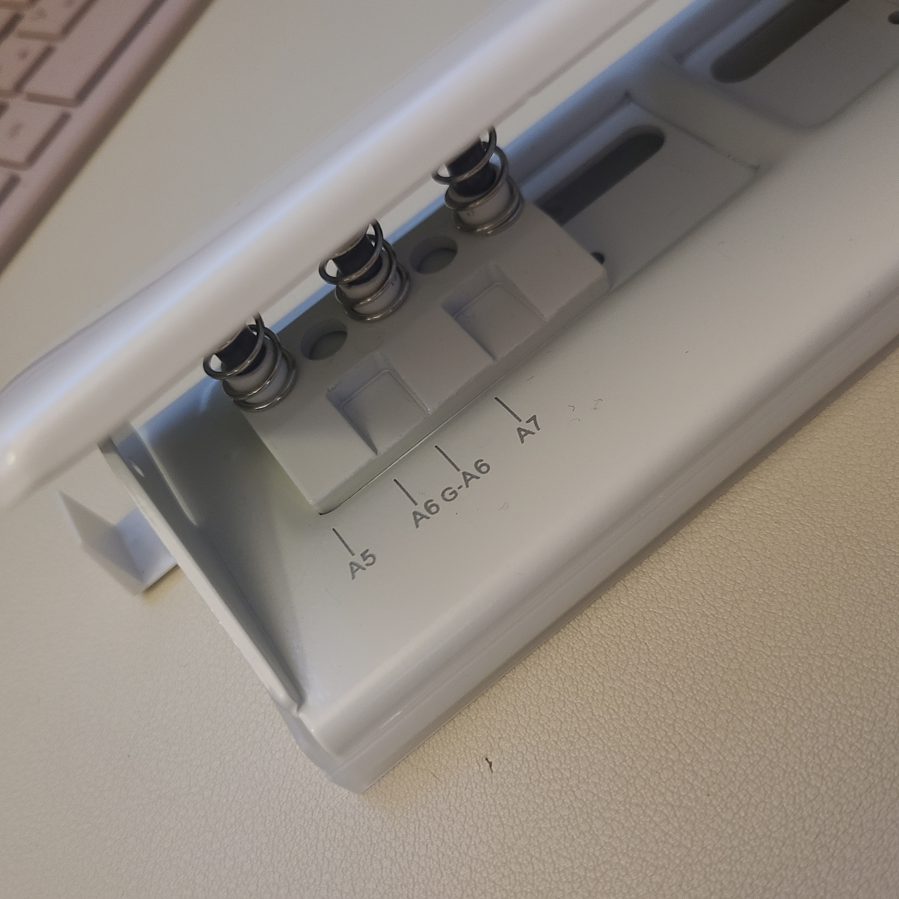 바닥쪽에 저렇게 뺄 수 있는 부분이 있는데, 뒤어 나온 부분 안쪽을 보면 사이즈가 적여있는데 A5라는 숫자가 타공기 본체에 딱 맞게끔 맞추면 된다. 그러면 종이 중앙 위치를 매번 신경쓸 필요없이, A5를 세로로 세워서 튀어나온 가이드에 딱 맞게 맞추면 중앙 위치로 매번 같은 위치에 타공이 된다.