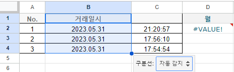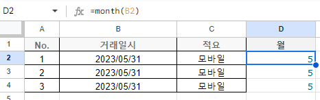 거래일시를 그대로 시트레 붙여넣고, month 함수를 적용해보도록 하겠습니다.