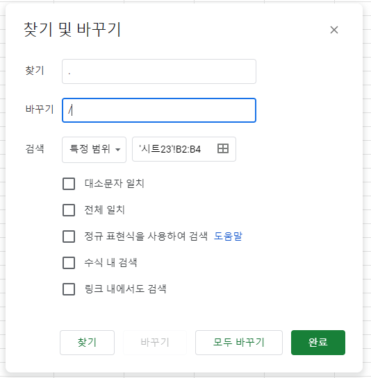 거래일시 데이터를 모두 선택해서, Ctrl+H를 눌러 마침표를 전부 슬러시로 변환하겠습니다.