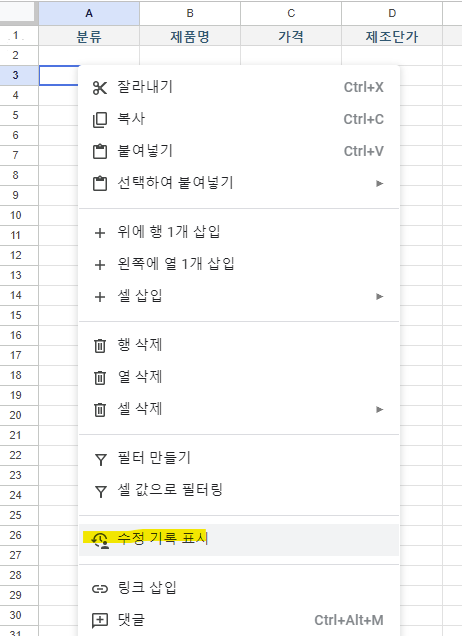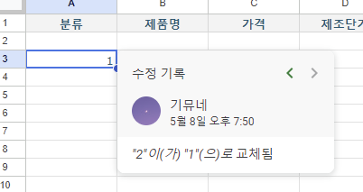 분명 데이터가 수정이 됐는데, 누가 했는지 알수가 없는 상황이거나 원래 데이터를 확인해야 하는 경우 해당 셀의 수정이력을 확인하는 방법입니다.